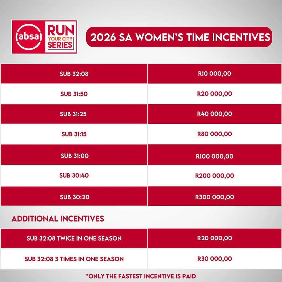R20 000 bonus for breaking 32:08 twice during the 2026 series.