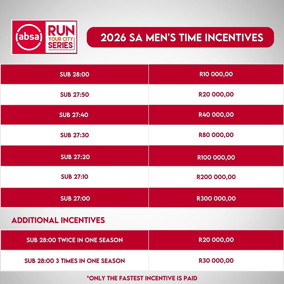R30 000 bonus for breaking 28 minutes three times in 2026.