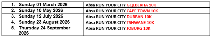 EVENT DATES: 2026 Absa RUN YOUR CITY Series